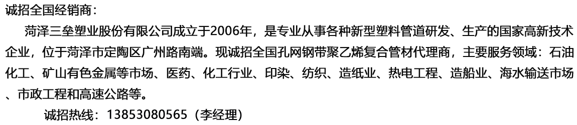 菏澤三壘塑業(yè)股份有限公司專業(yè)從事各種新型塑料管道研發(fā)和生產,重點研發(fā)了孔網鋼帶聚乙烯復合管材